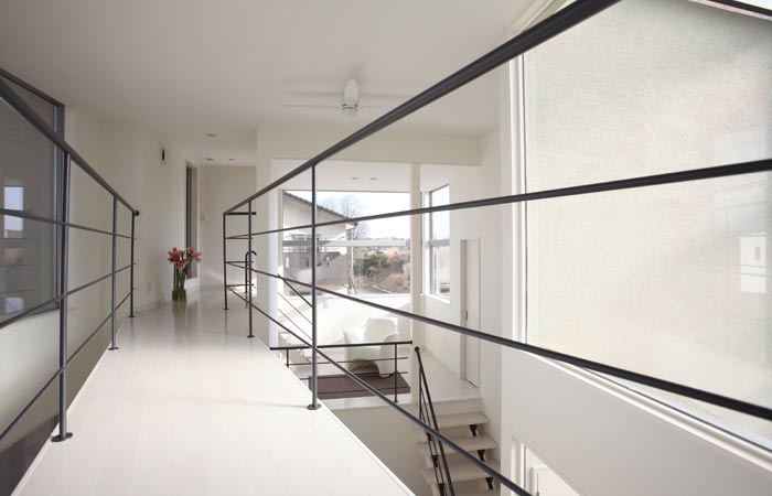 リビングの高い天井を利用して渡り廊下を通すことで空間を多く取り