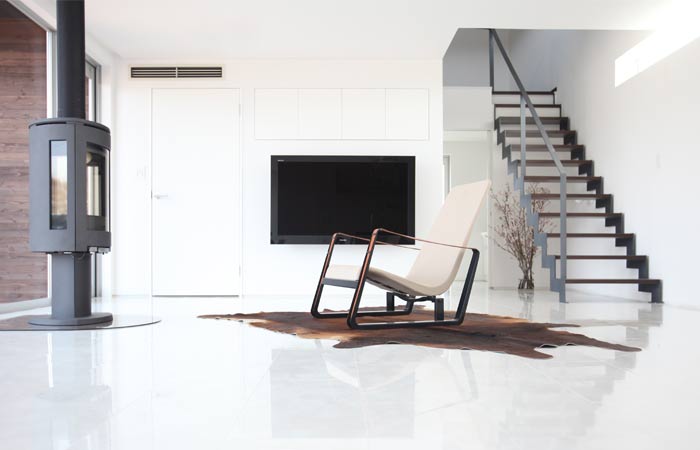 光沢のある床材を使用しているリビングは太陽の光や照明をやわらかに反射して